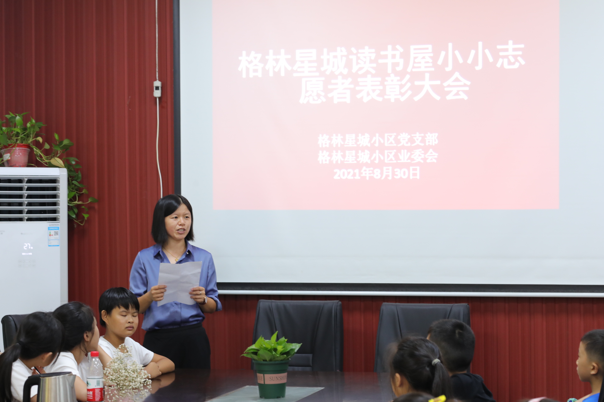 清潔活動(dòng)結(jié)束后,大家步行前往格林星城小區(qū)黨支部參加“格林星城讀書屋小小志愿者表彰大會(huì)”。會(huì)上,小區(qū)黨支部書記兼業(yè)委會(huì)主任彭佩講話,她感謝了長(zhǎng)沙路橋黨委一直以來(lái)對(duì)黃泥嶺社區(qū)工作的支持與關(guān)懷,并期待能有更多人積極投身于志愿服務(wù),傳承和發(fā)揚(yáng)“奉獻(xiàn)、友愛、互助、進(jìn)步”的雷鋒精神,為建設(shè)更加宜居、和諧、幸福的社區(qū)貢獻(xiàn)一份力量。緊接著,公司黨員代表為在場(chǎng)的小志愿者們頒發(fā)筆記本、鉛筆等獎(jiǎng)品,鼓勵(lì)小朋友們好好學(xué)習(xí),多多參加志愿服務(wù)活動(dòng)。